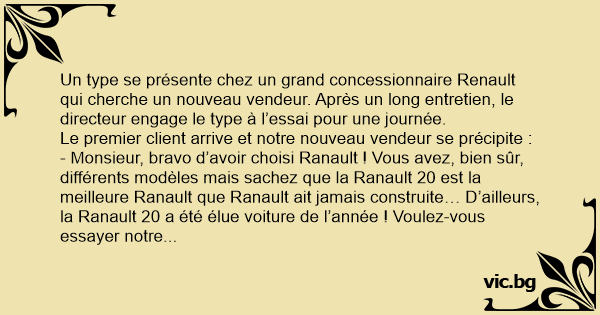 Un type se présente chez un grand concessionnaire Renault qui cherche un nouveau vendeur. Après un long entretien, le directeur engage le type à l’essai pour une journée.