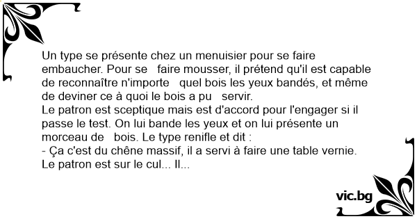 Un type se présente chez un menuisier pour se faire embaucher. Pour se faire mousser, il prétend qu'il est capable de reconnaître n'importe quel bois les yeux bandés, et même de deviner ce à quoi le bois a pu servir.