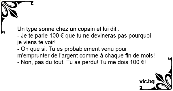 - Non, pas du tout. Tu as perdu! Tu me dois 100 €!
