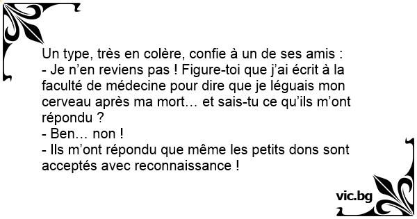 - Je n’en reviens pas ! Figure-toi que j’ai écrit à la faculté de médecine pour dire que je léguais mon cerveau après ma mort… et sais-tu ce qu’ils m’ont répondu ?