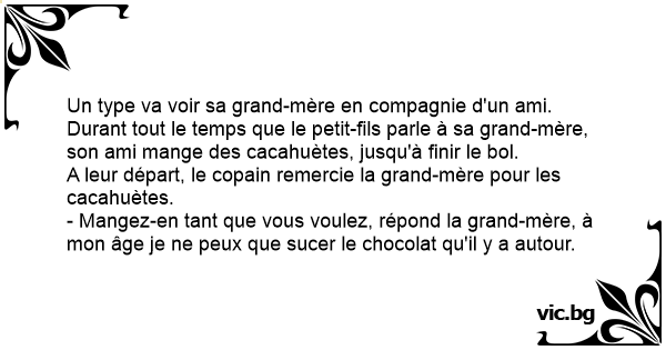 - Mangez-en tant que vous voulez, répond la grand-mère, à mon âge je ne peux que sucer le chocolat qu'il y a autour.