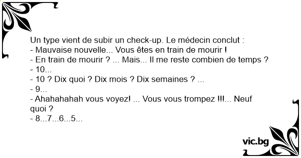 Одбројување Ο ετοιμοθάνατος. Един човек отишъл на доктор да му направят пълни изследвания. Σου δίνω 10 Doctor: "I'm sorry but you suffer from a terminal illness and have only 10 to live." Un tizio si presenta dal dottore per una visita completa dato che è un po' di tempo che non si sente bene. Dopo la visita il dottore si rivolge al paziente e dice: "Sono spiacente, ma ho delle brutte notizie. Voi state molto male e non vi resta molto tempo". "Oh no, e' terribile. Quanto tempo mi... Un gars va chez son médecin pour faire un check-up, car depuis quelques temps, ça ne va vraiment plus très fort. Le médecin après auscultation et résultats de divers examens lui dit: - Ah là là, j'ai bien peur de n'avoir que des mauvaises nouvelles... Een man komt bij de dokter en na controle zegt de dokter: "U hebt niet lang meer te leven." De man zegt: "Dokter, hoe lang nog?" "Nog 10", antwoordt de dokter. "10 wat?", vraagt de man, "jaren,... Pasienten: Doktor, hvor lenge har jeg igjen? Doktoren: 10. Pasienten: 10 hva? Dager? Uker? Måneder? År? Doktoren: 9.. 8.. 7.. 6.. Er komt een man bij de dokter en zegt: "Dokter ik voel me niet lekker." De dokter onderzoekt hem en vraagt hem de volgende week terug te komen. Na een week komt de man terug en vraagt: "Nou dokter,...
