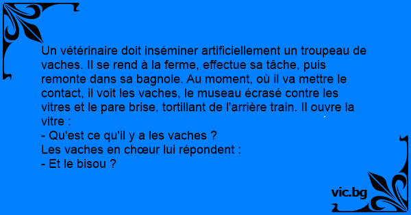 Un vétérinaire doit inséminer artificiellement un troupeau de vaches. Il se rend à la ferme, effectue sa tâche, puis remonte dans sa bagnole. Au moment, où il va mettre le contact, il voit les vaches, le museau écrasé contre les vitres et le pare brise, tortillant de l'arrière train. Il ouvre la vitre :