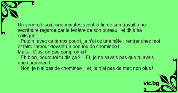 Un vendredi soir, cinq minutes avant la fin de son travail, une secrétaire regarde par la fenêtre de son bureau, et dit à sa collègue :