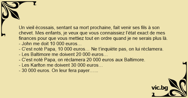 Un vieil écossais, sentant sa mort prochaine, fait venir ses fils à son chevet. Mes enfants, je veux que vous connaissiez l’état exact de mes finances pour que vous mettiez tout en ordre quand je ne serais plus là.