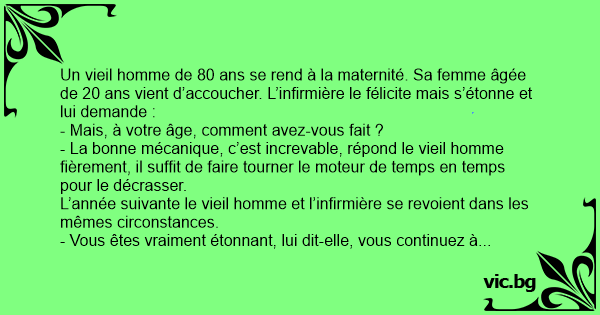 Un vieil homme de 80 ans se rend à la maternité. Sa femme âgée de 20 ans vient d’accoucher. L’infirmière le félicite mais s’étonne et lui demande :
