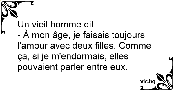 - À mon âge, je faisais toujours l'amour avec deux filles. Comme ça, si je m'endormais, elles pouvaient parler entre eux.