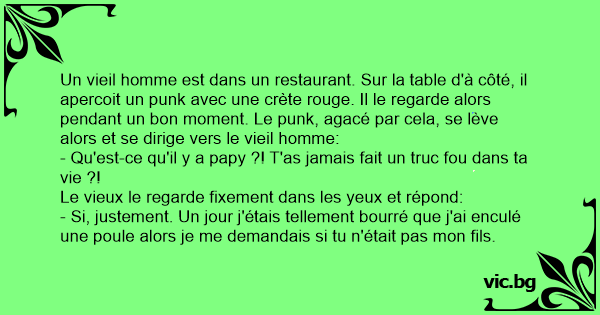 - Si, justement. Un jour j'étais tellement bourré que j'ai enculé une poule alors je me demandais si tu n'était pas mon fils.