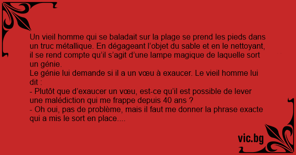 Un vieil homme qui se baladait sur la plage se prend les pieds dans un truc métallique. En dégageant l’objet du sable et en le nettoyant, il se rend compte qu’il s’agit d’une lampe magique de laquelle sort un génie.