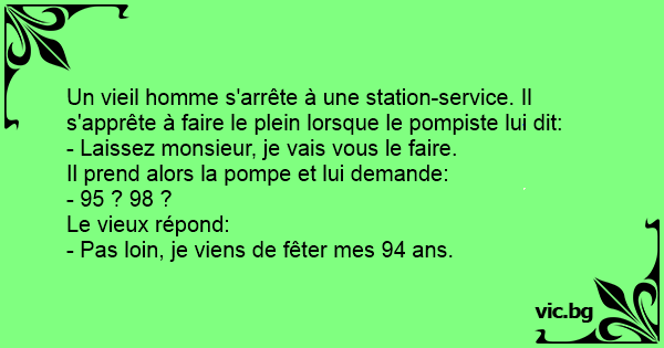 Un vieil homme s'arrête à une station-service. Il s'apprête à faire le plein lorsque le pompiste lui dit: