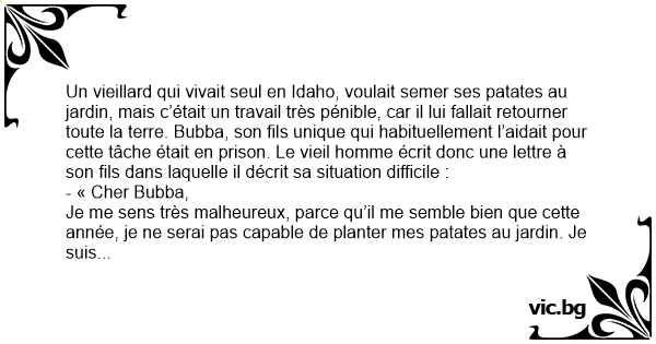Un vieillard qui vivait seul en Idaho, voulait semer ses patates au jardin, mais c’était un travail très pénible, car il lui fallait retourner toute la terre. Bubba, son fils unique qui habituellement l’aidait pour cette tâche était en prison. Le vieil homme écrit donc une lettre à son fils dans laquelle il décrit sa situation difficile :