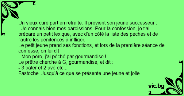 Le petit jeune prend ses fonctions, et lors de la première séance de confesse, on lui dit :