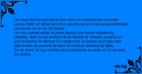 Un vieux fermier prenait le frais dans sa véranda par une belle soirée d’été, en observant d’un œil amusé son coq qui pourchassait une poule sur le tas de fumier.