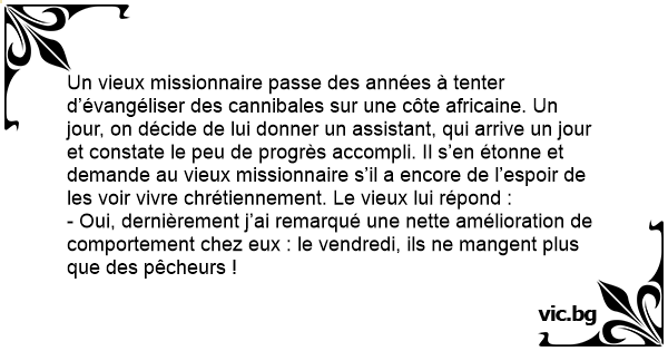 Un vieux missionnaire passe des années à tenter d’évangéliser des cannibales sur une côte africaine. Un jour, on décide de lui donner un assistant, qui arrive un jour et constate le peu de progrès accompli. Il s’en étonne et demande au vieux missionnaire s’il a encore de l’espoir de les voir vivre chrétiennement. Le vieux lui répond :