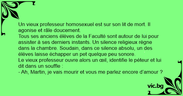 Un vieux professeur homosexuel est sur son lit de mort. Il agonise et râle doucement.