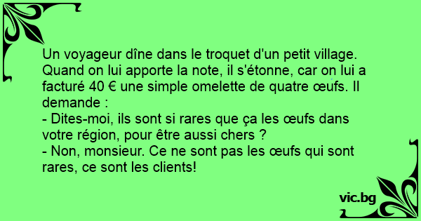 Un voyageur dîne dans le troquet d'un petit village. Quand on lui apporte la note, il s'étonne, car on lui a facturé 40 € une simple omelette de quatre œufs. Il demande :