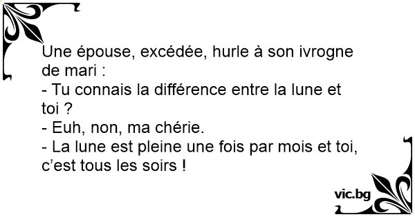 Une épouse, excédée, hurle à son ivrogne de mari :