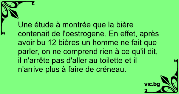Une étude à montrée que la bière contenait de l'oestrogene. En effet, après avoir bu 12 bières un homme ne fait que parler, on ne comprend rien à ce qu'il dit, il n'arrête pas d'aller au toilette et il n'arrive plus à faire de créneau.