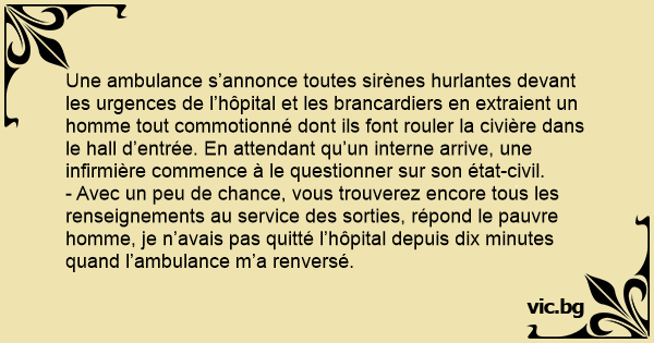 - Avec un peu de chance, vous trouverez encore tous les renseignements au service des sorties, répond le pauvre homme, je n’avais pas quitté l’hôpital depuis dix minutes quand l’ambulance m’a renversé.