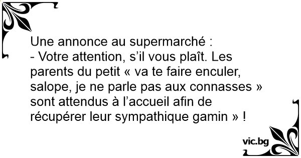 - Votre attention, s’il vous plaît. Les parents du petit « va te faire enculer, sаlоре, je ne parle pas aux connasses » sont attendus à l’accueil afin de récupérer leur sympathique gamin » !
