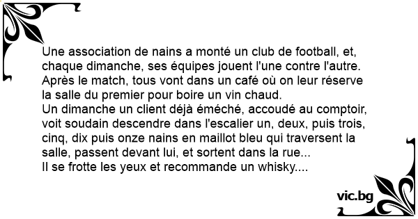 Il se frotte les yeux et recommande un whisky. A peine l'a-t-il bu qu'il voit un, deux, cinq, dix puis onze nains en maillot rouge descendre à leur tour l'escalier, passer devant lui, et sortir dans la rue. Alors il appelle le propriétaire du bistrot et lui dit à l'oreille :