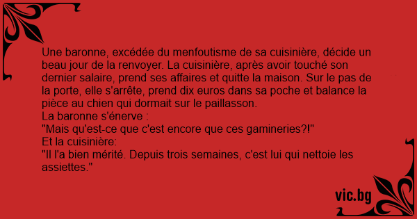 Une baronne, excédée du menfoutisme de sa cuisinière, décide un beau jour de la renvoyer. La cuisinière, après avoir touché son dernier salaire, prend ses affaires et quitte la maison. Sur le pas de la porte, elle s'arrête, prend dix euros dans sa poche et balance la pièce au chien qui dormait sur le paillasson.