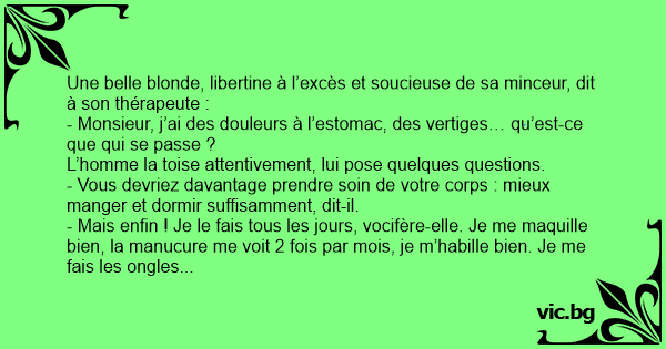 Une belle blonde, libertine à l’excès et soucieuse de sa minceur, dit à son thérapeute :