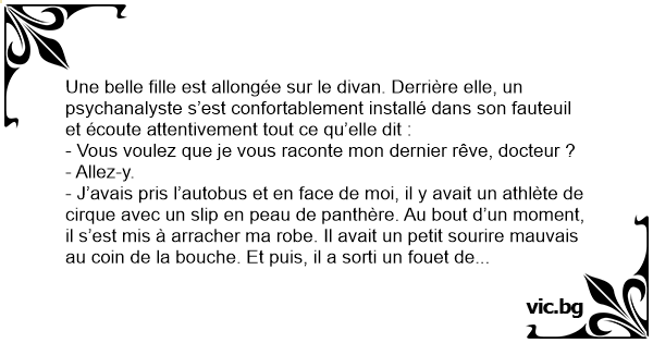 - J’avais pris l’autobus et en face de moi, il y avait un athlète de cirque avec un slip en peau de panthère. Au bout d’un moment, il s’est mis à arracher ma robe. Il avait un petit sourire mauvais au coin de la bouche. Et puis, il a sorti un fouet de sous la banquette. Alors, tous les gens qui étaient dans l’autobus, ont commencé à se déshabiller en douce. Même un agent de police, docteur, et il vous ressemblait furieusement. Il n’a gardé que son képi et son ceinturon. Et je l’ai vu qui se rentrait son bâton dans le cul en poussant des petits cris. Alors l’homme au fouet l’a regardé dans le blanc des yeux. Il lui a donné une baffe magistrale et lui a ordonné de me… Oh ! Mon Dieu, il est cinq heures ! La consultation est terminée… Au revoir docteur. A la prochaine fois !
