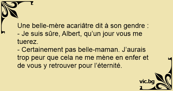 - Certainement pas belle-maman. J’aurais trop peur que cela ne me mène en enfer et de vous y retrouver pour l’éternité.