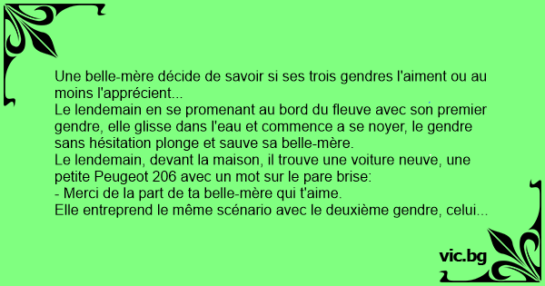 Une belle mère veut tester ses 3 gendres. Elle les prend un par un et décide à chaque fois de simuler une chute à l'eau. Le premier sans hésiter, saute à l'eau et vient la sauver de la noyade. Le lendemain, il retrouve devant sa maison une jolie Peugeot avec un mot "De la part de ta belle mère...