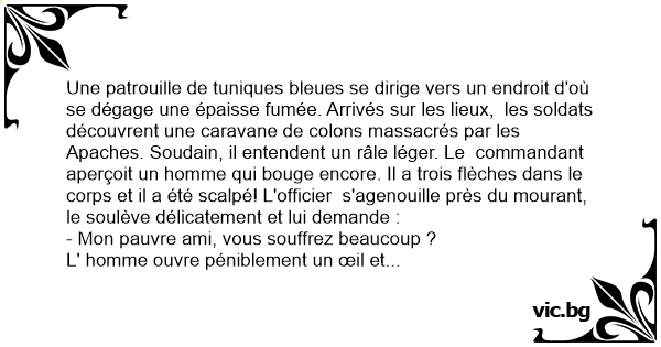 Une patrouille de tuniques bleues se dirige vers un endroit d'où se dégаgе une épaisse fumée. Arrivés sur les lieux, les soldats découvrent une caravane de colons massacrés par les Apaches. Soudain, il entendent un râle léger. Le commandant aperçoit un homme qui bouge encore. Il a trois flèches dans le corps et il a été scalpé! L'officier s'agenouille près du mourant, le soulève délicatement et lui demande :