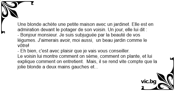 Une blonde achète une petite maison avec un jardinet. Elle est en admiration devant le potager de son voisin. Un jour, elle lui dit :