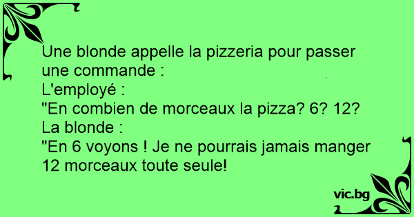 Une blonde commande une pizza : - Bonjour je voudrais une 4 fromages s'il vous plait - On vous la découpe en 6 parts ou 12 ? - En 6, je ne pourrais pas en manger 12