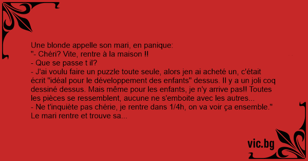 Une blonde apelle son mari, elle est en pleure : - J'en peut plus, ça fait des heures que je suis bloqué sur ce puzzle. - Ah bon, laisse moi regarder... Ah oui, Alors, je te propose de remettre les...