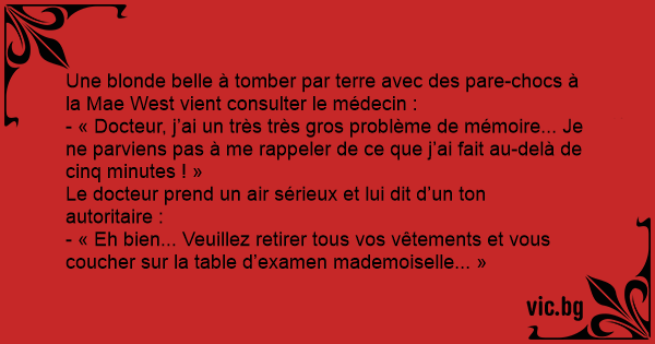 Une blonde belle à tomber par terre avec des pare-chocs à la Mae West vient consulter le médecin :