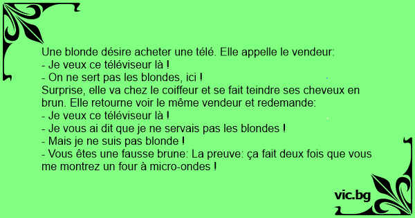 Dans un magasin ,une blonde demande à un vendeur: - Je voudrai cette télé la !!! - Madame on ne sert pas les blondes ! La blonde sort et revient . - Je voudrai cette télé là !! - Madame on ne sert...