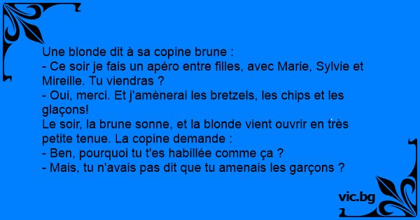 Le soir, la brune sonne, et la blonde vient ouvrir en très petite tenue. La copine demande :