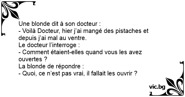 - Voilà Docteur, hier j’ai mangé des pistaches et depuis j’ai mal au ventre.