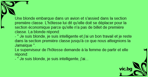 Une blonde embarque dans un avion et s'assied dans la section première classe. L'hôtesse lui dit qu'elle doit se déplacer pour la section économique parce qu'elle n'a pas de billet de première classe. La blonde répond: