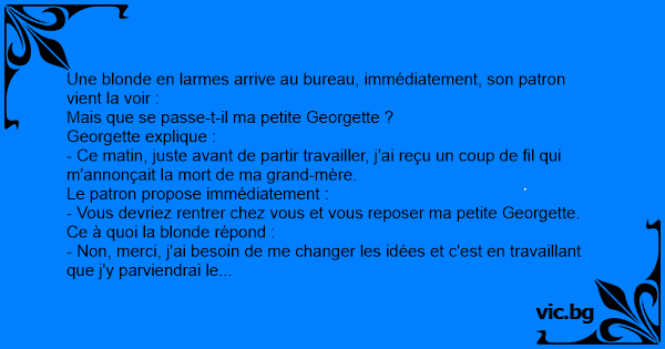 Quelques heures plus таrd, le patron vient revoir son employée. Il la retrouve effondré sur son bureau, pleurant toutes les larmes de son corps. Il demande :