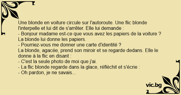 Une blonde en voiture circule sur l'autoroute. Une flic blonde l'interpelle et lui dit de s'arrêter. Elle lui demande :