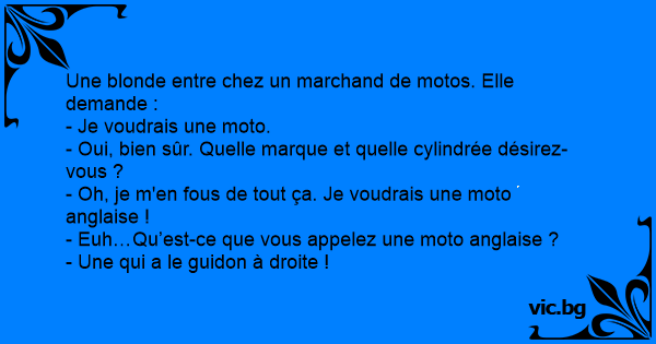 - Oh, je m'en fous de tout ça. Je voudrais une moto anglaise !