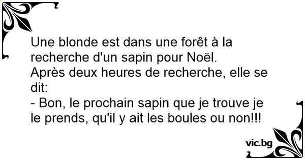 Deux blondes vont chercher un sapin de Noël dans la forêt. Après deux heures de recherche, l'une dit à l'autre : - Assez ! La prochaine fois qu'on aperçoit un sapin, on le ramasse qu'il ait des boules ou pas !