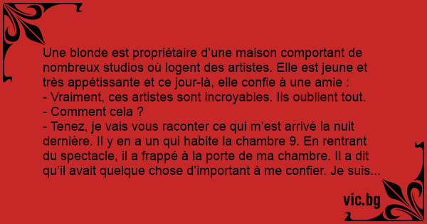 Une blonde est propriétaire d’une maison comportant de nombreux studios où logent des artistes. Elle est jeune et très appétissante et ce jour-là, elle confie à une amie :