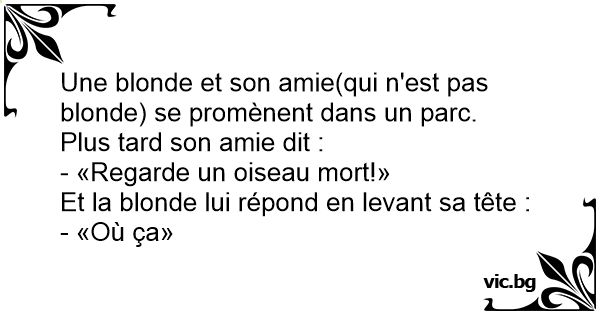 Deux blonde se promènent, soudainement ; l'une s'écrit : - Oh ! Regarde un oiseau mort ! - Où ça ?! Demande l'autre en regardant le ciel.