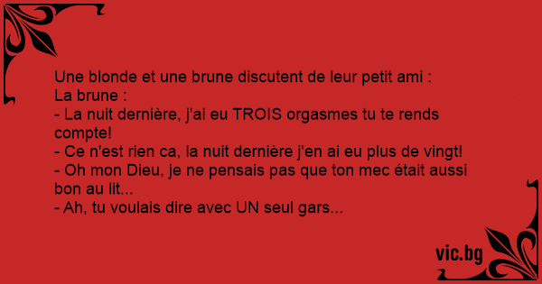 Blondýnka a brunetka si vyprávějí o svých partnerech. Bruneta povídá: „Poslední noc jsem měla tři orgasmy za sebou!” Blondýna na to: „To nic není, já jich měla včera v noci asi sto...!” Brunetka...