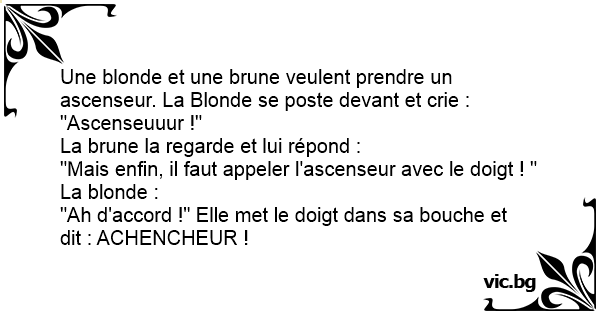 Une blonde et une brune veulent prendre un ascenseur. La Blonde se poste devant et crie :