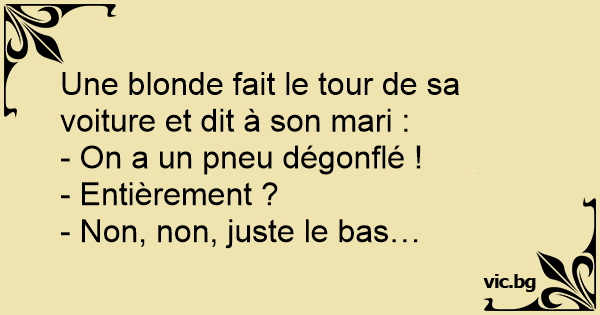 Une blonde fait le tour de sa voiture et dit à son mari :