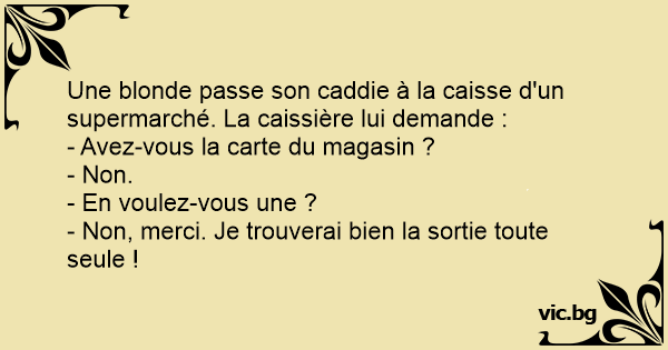 Une blonde passe son caddie à la caisse d'un supermarché. La caissière lui demande :