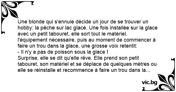 Une blonde qui s'ennuie décide un jour de se trouver un hobby: la pêche sur lac glacé. Une fois installée sur la glace avec un petit tabouret, elle sort tout le matériel, l'équipement nécessaire, puis au moment de commencer à faire un trou dans la glace, une grosse voix retentit:
